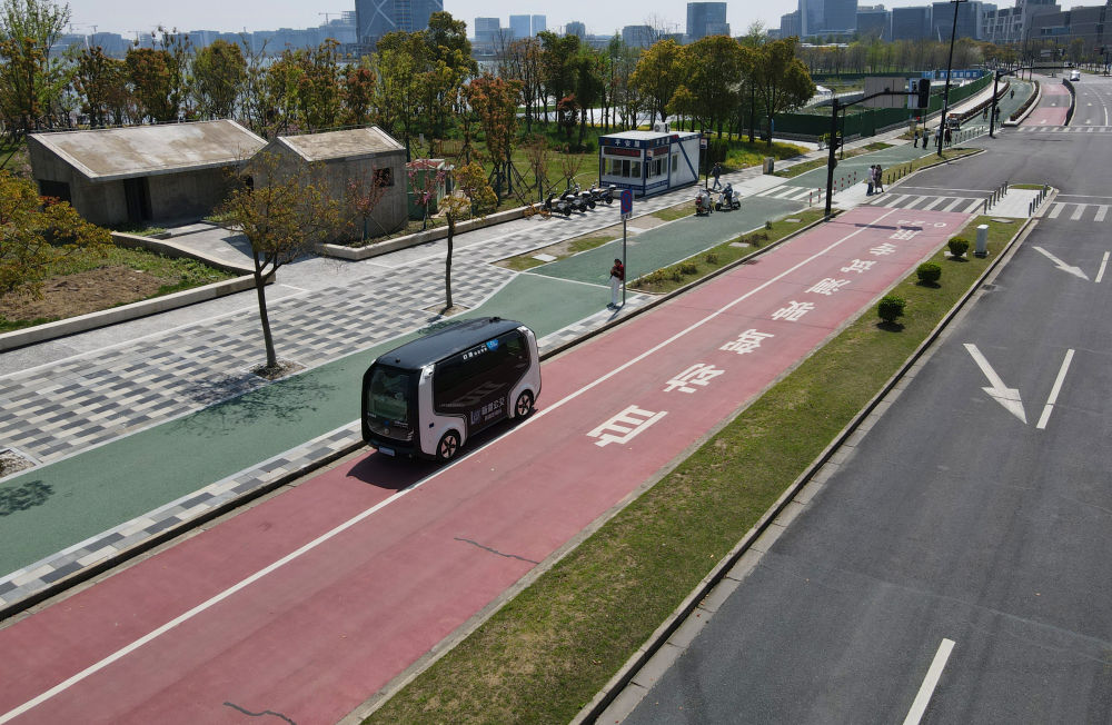 在中國(guó)(上海)自由貿(mào)易試驗(yàn)區(qū)臨港新片區(qū),一輛無(wú)人駕駛汽車(chē)行駛在自動(dòng)駕駛測(cè)試專用路上(無(wú)人機(jī)照片,2024年4月9日攝)。