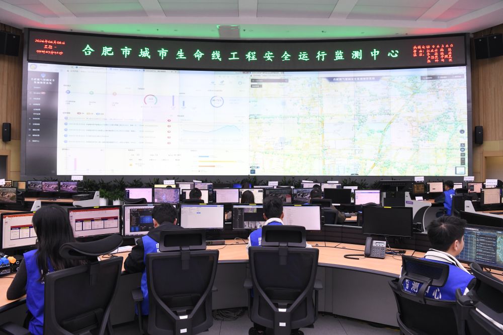 技術(shù)人員在位于清華大學(xué)合肥公共安全研究院的合肥市城市生命線工程安全運行監(jiān)測中心值守(2024年4月8日攝)。合肥市2015年啟動城市生命線安全工程建設(shè),逐步構(gòu)建燃氣、橋梁、供水、排水、熱力、綜合管廊、消防、水環(huán)境八大領(lǐng)域立體化監(jiān)測網(wǎng),探索出一條以場景應(yīng)用為依托、以智慧防控為導(dǎo)向、以創(chuàng)新驅(qū)動為內(nèi)核、以市場運作為抓手的城市安全發(fā)展新模式。