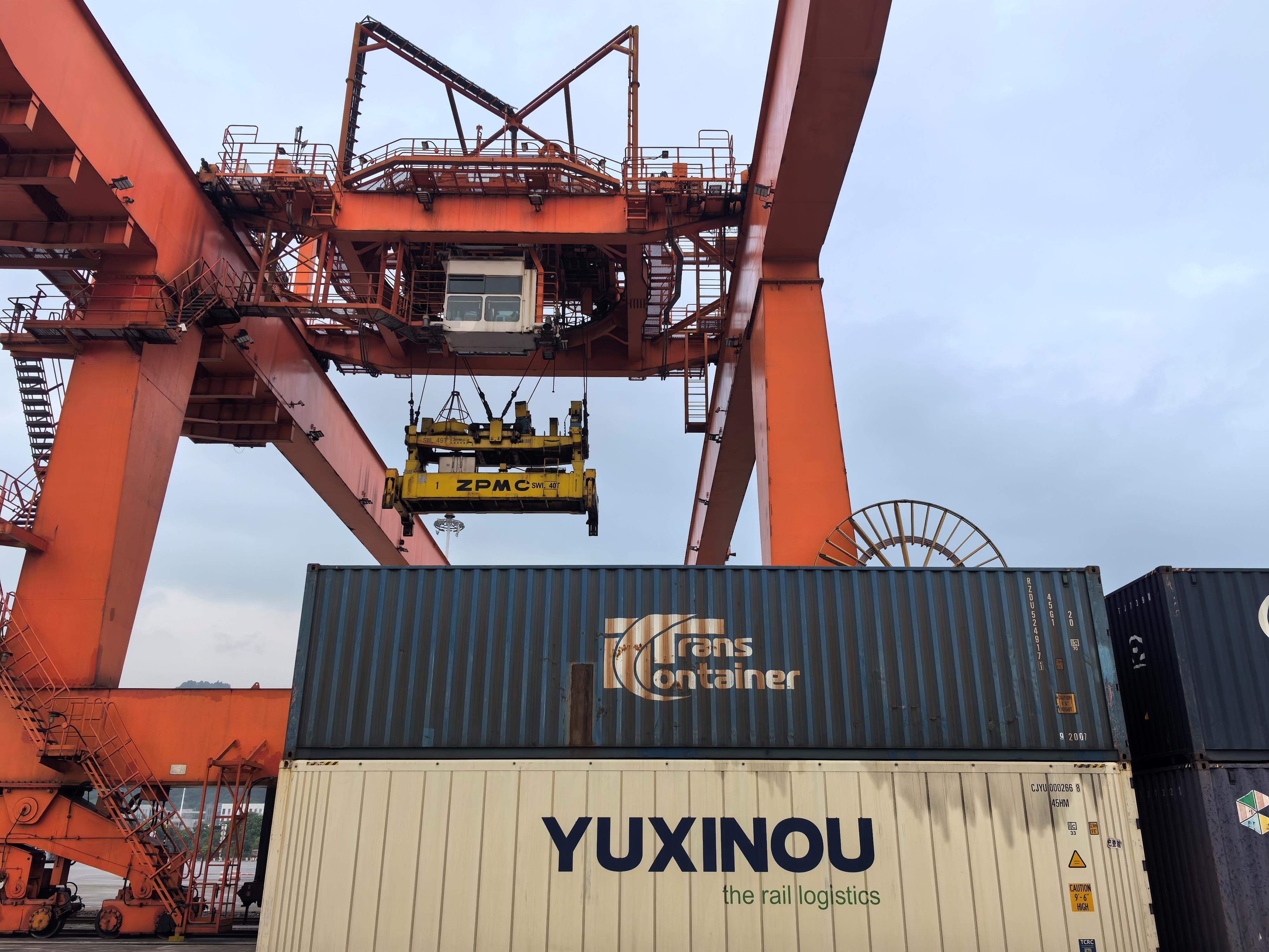 重慶國際物流樞紐園區(qū)內,中歐班列運送的“渝新歐”集裝箱整齊排列。(總臺央廣記者潘毅拍攝)