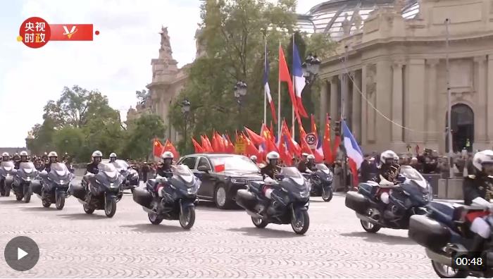 當(dāng)?shù)貢r(shí)間5月6日下午,歡迎儀式后,習(xí)近平主席和夫人彭麗媛在共和國(guó)衛(wèi)隊(duì)148名騎兵組成的禮兵馬隊(duì)和摩托車隊(duì)護(hù)衛(wèi)下,乘車前往愛麗舍宮。