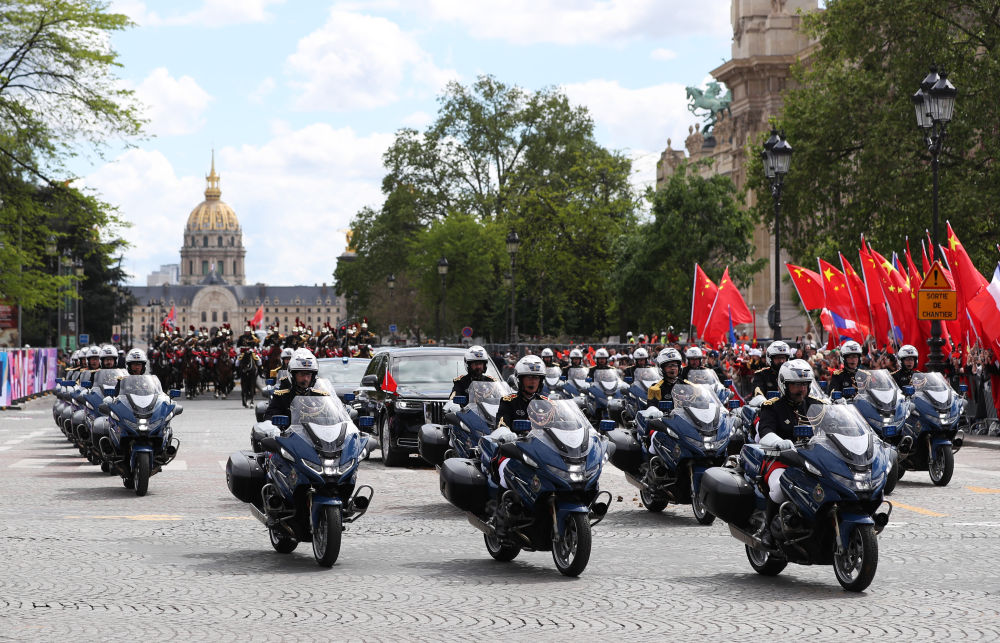 當(dāng)?shù)貢r(shí)間5月6日下午,正在法國進(jìn)行國事訪問的國家主席習(xí)近平在巴黎出席法國總統(tǒng)馬克龍舉行的隆重盛大歡迎儀式。這是歡迎儀式后,習(xí)近平和夫人彭麗媛在共和國衛(wèi)隊(duì)148名騎兵組成的禮兵馬隊(duì)和摩托車隊(duì)護(hù)衛(wèi)下,乘車前往愛麗舍宮。新華社記者 高靜 攝