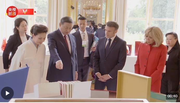 當(dāng)?shù)貢r(shí)間5月6日下午,國家主席習(xí)近平在巴黎愛麗舍宮同法國總統(tǒng)馬克龍舉行會談。會談前,習(xí)近平向馬克龍贈送圖書。
