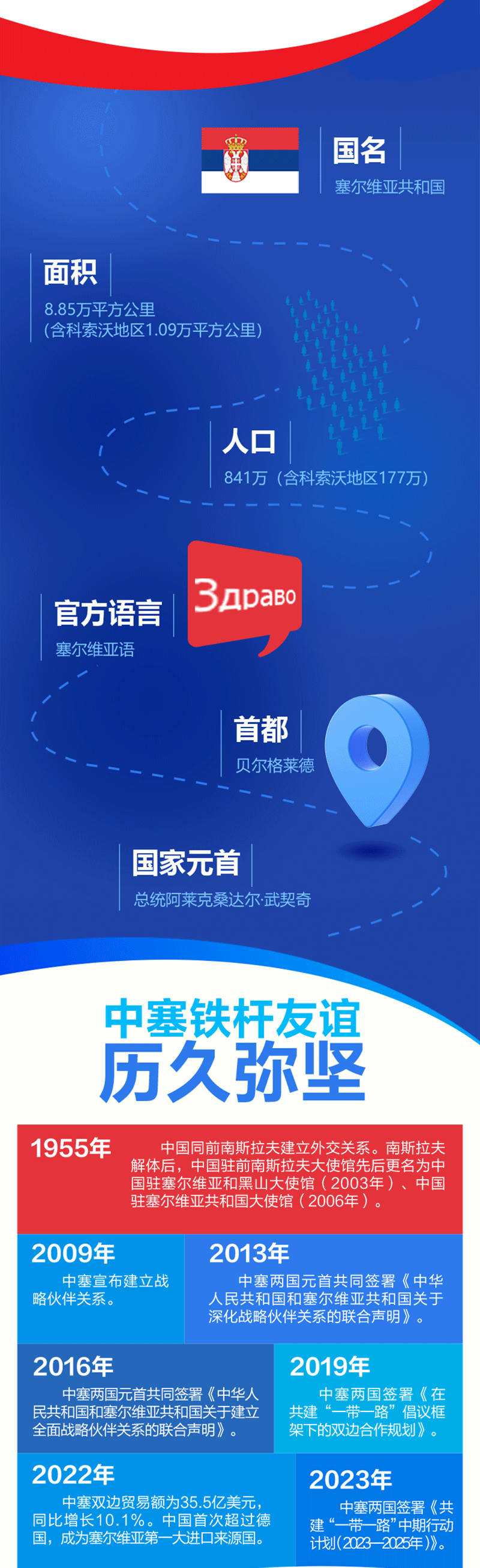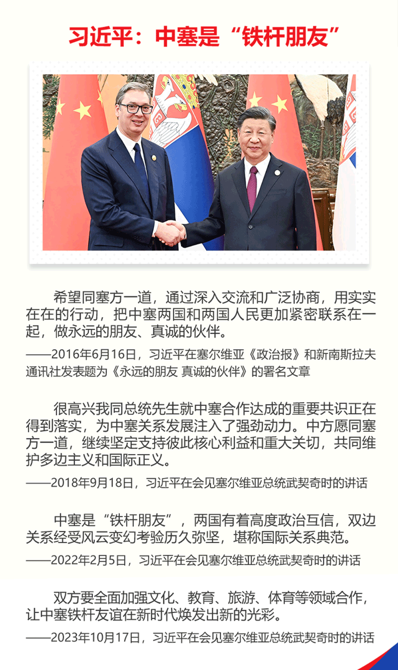 這是時隔近八年,習主席再次對塞爾維亞進行國事訪問。中塞是“鐵桿朋友”,習主席指出,希望同塞方一道,通過深入交流和廣泛協(xié)商,用實實在在的行動,把中塞兩國和兩國人民更加緊密聯(lián)系在一起,做永遠的朋友、真誠的伙伴。