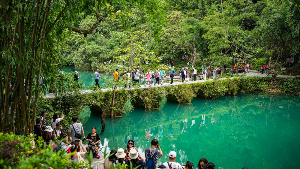 初夏時節(jié),貴州省黔南布依族苗族自治州荔波縣小七孔景區(qū)綠意盎然、風光秀美,吸引眾多游客前來觀光游玩。新華社記者 陶亮 攝