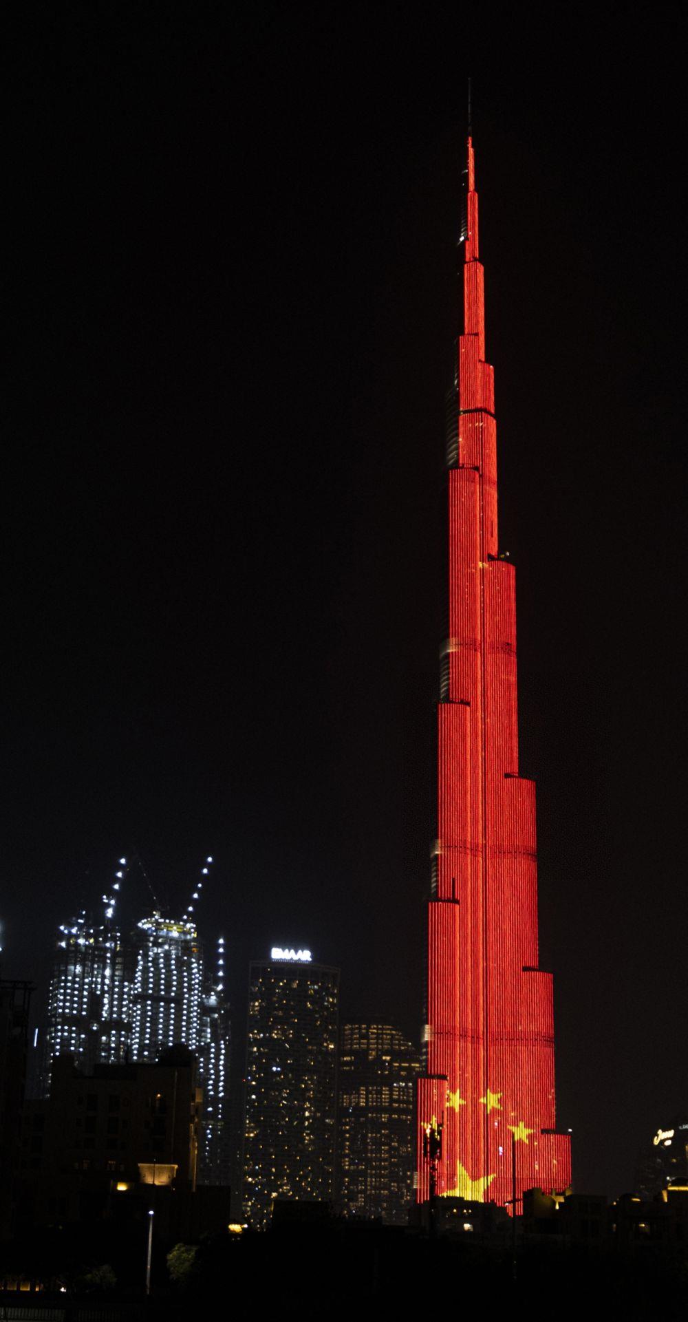 當(dāng)?shù)貢r間2020年2月2日,在阿聯(lián)酋迪拜,當(dāng)?shù)氐貥?biāo)建筑物哈利法塔點亮中國國旗圖案,為中國抗擊新冠肺炎疫情加油。