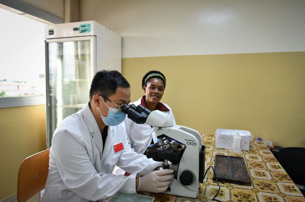 5月16日,在赤道幾內(nèi)亞馬拉博地區(qū)醫(yī)院,中國(guó)醫(yī)生同當(dāng)?shù)赝乱黄饳z測(cè)樣本。