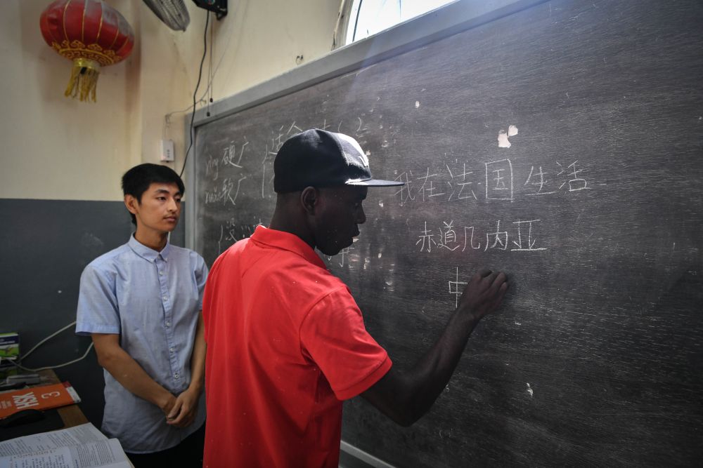 5月17日,在赤道幾內(nèi)亞國(guó)立大學(xué),當(dāng)?shù)貙W(xué)生在孔子學(xué)院上中文課。