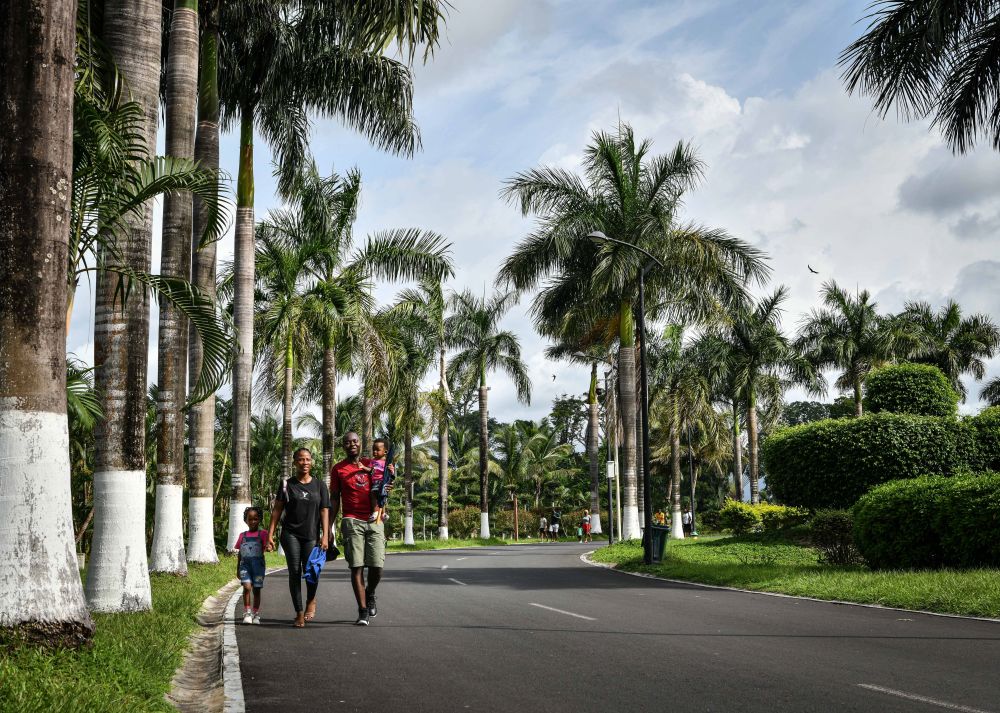 5月19日,在赤道幾內(nèi)亞首都馬拉博,當(dāng)?shù)鼐用裨谥袊?guó)企業(yè)承建的馬拉博國(guó)家公園里散步。