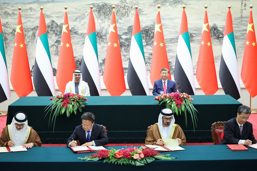 5月30日下午,國家主席習(xí)近平在北京人民大會堂同來華國事訪問并出席中國-阿拉伯國家合作論壇第十屆部長級會議開幕式的阿聯(lián)酋總統(tǒng)穆罕默德舉行會談。這是會談后,兩國元首共同見證簽署多項(xiàng)雙邊合作文件。新華社記者 劉彬 攝