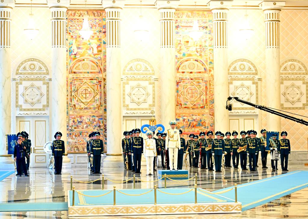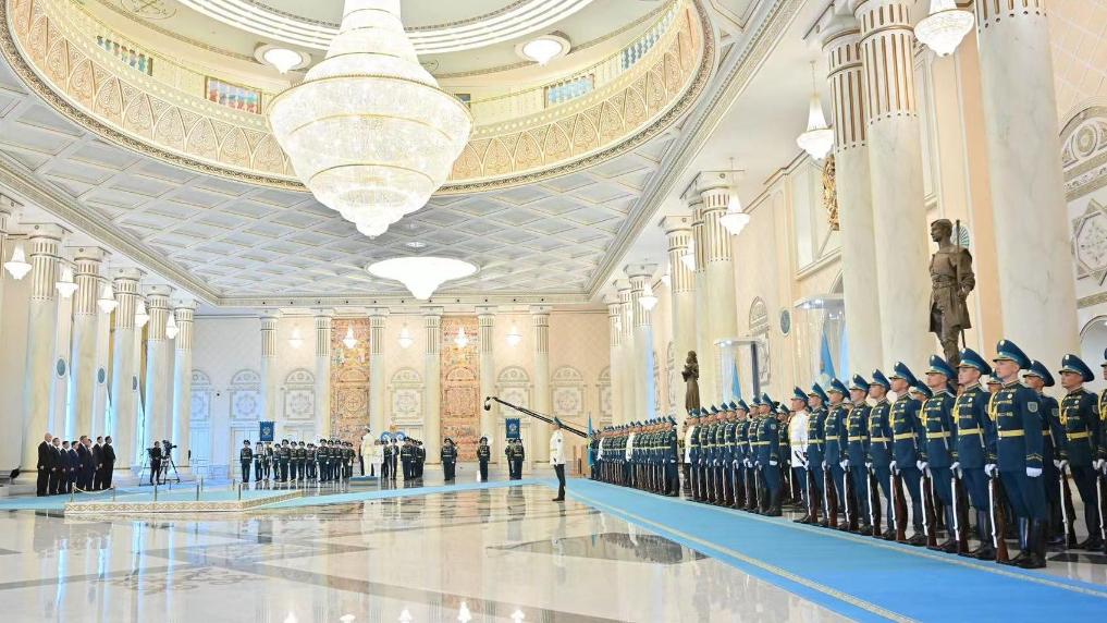托卡耶夫?yàn)榱?xí)近平舉行隆重歡迎儀式。總統(tǒng)府大廳氣勢(shì)恢宏,禮兵威武挺拔。兩國(guó)元首分別同對(duì)方陪同人員一一握手致意。兩國(guó)元首登上檢閱臺(tái),軍樂(lè)團(tuán)奏中哈兩國(guó)國(guó)歌。習(xí)近平在托卡耶夫陪同下檢閱儀仗隊(duì)。