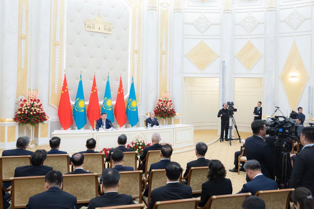 習(xí)近平在阿斯塔納總統(tǒng)府同托卡耶夫共同會(huì)見(jiàn)記者。