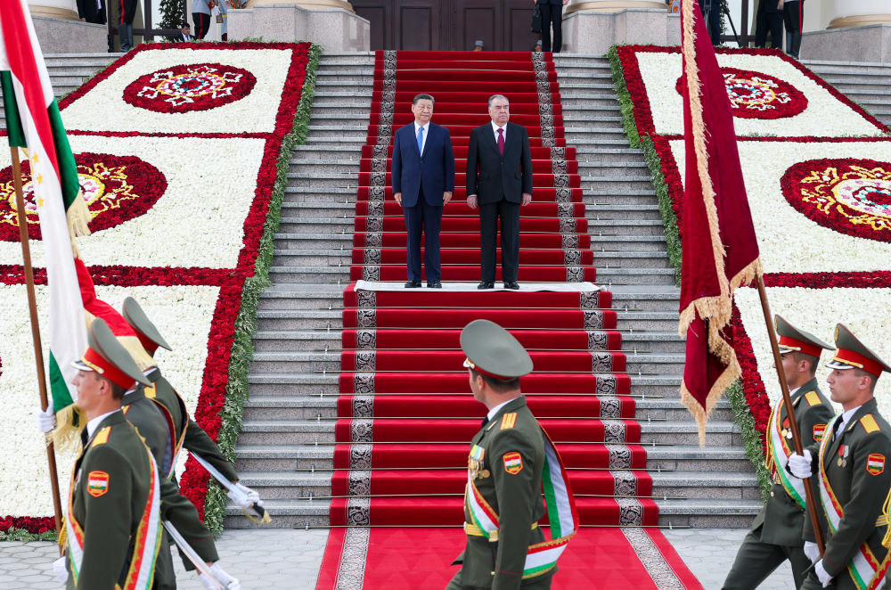 專機抵達杜尚別國際機場時,拉赫蒙率高級官員熱情迎接。塔吉克斯坦兒童向習近平獻花,用中、塔文歡迎習近平主席到訪。兩國元首在機場共同欣賞青年們表演的中塔歌舞。