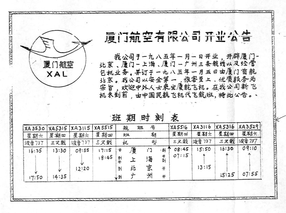 這是廈門航空開業(yè)公告。