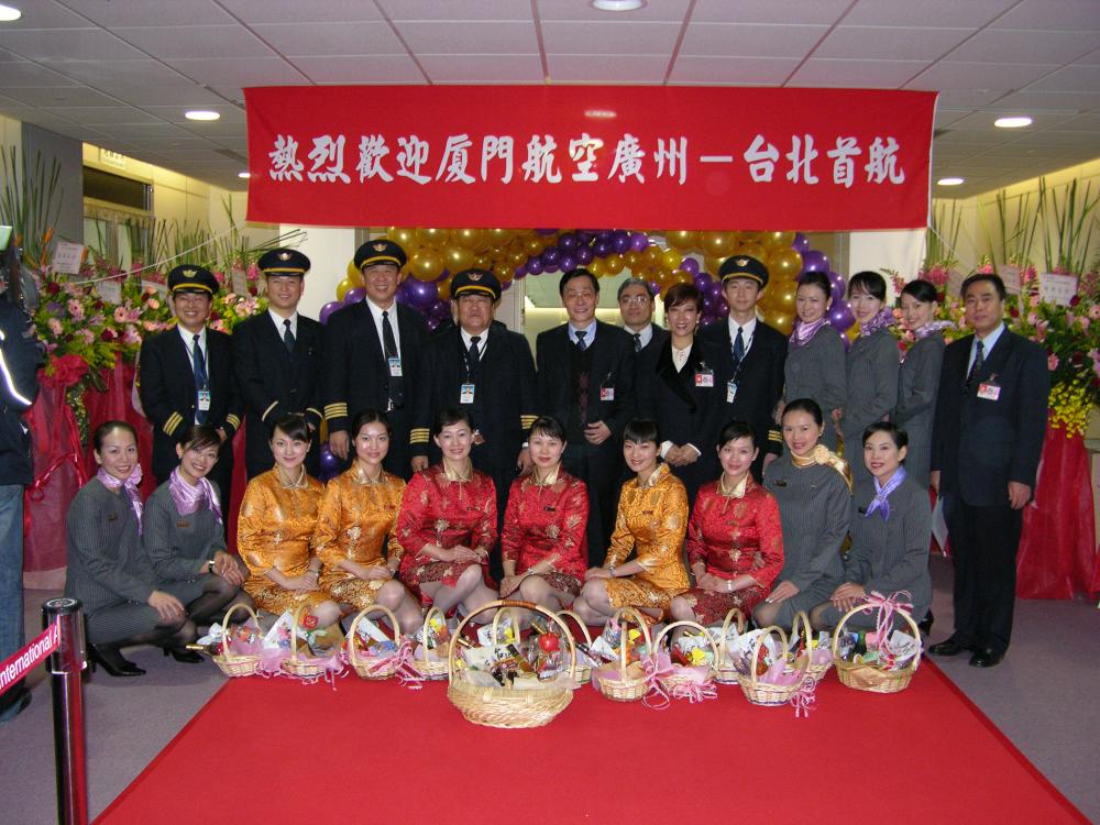 2005年,海峽兩岸首次開放春節(jié)包機。這是2005年1月29日,廈航作為大陸6家參與臺商春節(jié)包機直航的航空公司之一,圓滿完成了廣州-臺北往返包機任務。這是廈航首航臺北機組成員在臺北與迎接人員親切合影。
