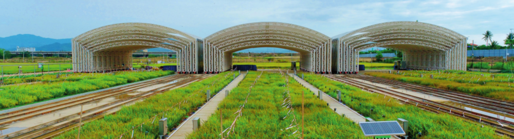 在位于三亞的國(guó)家耐鹽堿水稻技術(shù)創(chuàng)新中心崖州灣總部科研試驗(yàn)基地,建設(shè)了高標(biāo)準(zhǔn)試驗(yàn)田、鹽(堿)性精準(zhǔn)鑒定鹽池、自動(dòng)防雨鋼棚、水土鹽堿度智能化監(jiān)測(cè)系統(tǒng)等配套設(shè)施(2024年5月17日攝)。黎多江攝/本刊