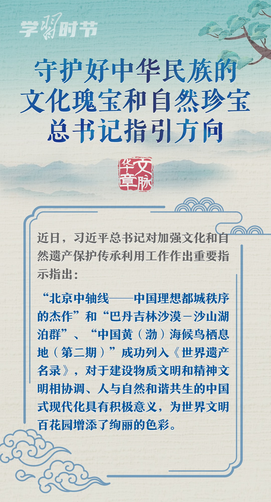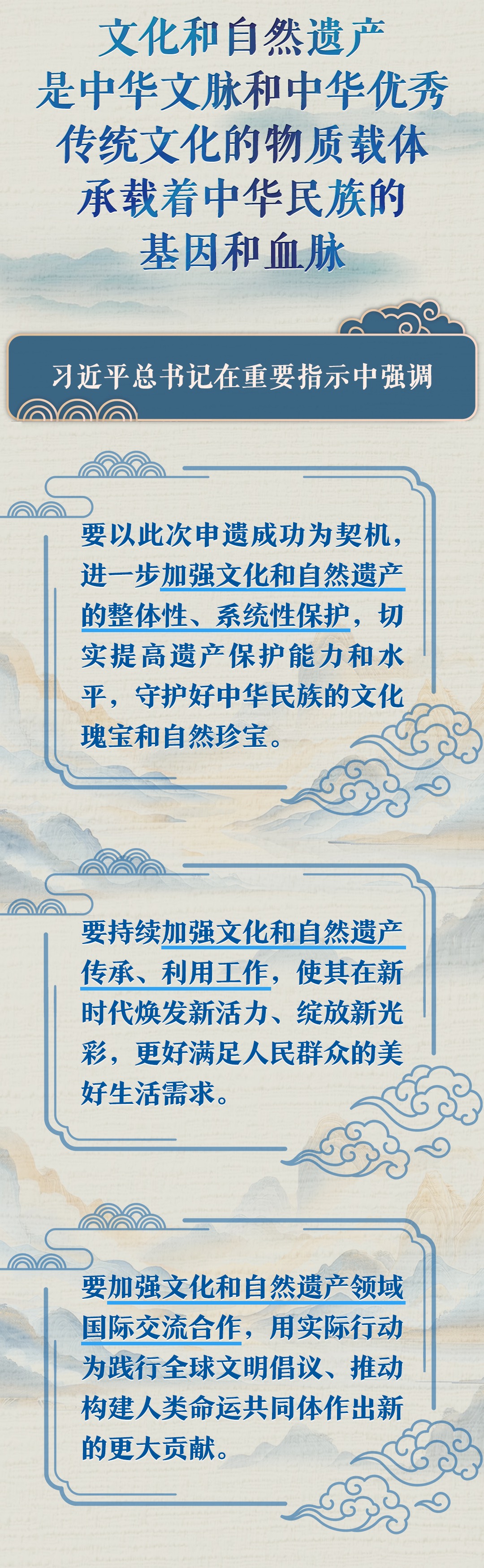 文化遺產(chǎn)體現(xiàn)了中華民族旺盛的生命力和創(chuàng)造力,自然遺產(chǎn)昭示了神奇的自然造化同中華民族的和諧依存關(guān)系。習(xí)近平總書記一直以來高度重視文化和自然遺產(chǎn)保護傳承利用工作,近日專門就此作出重要指示強調(diào),守護好中華民族的文化瑰寶和自然珍寶,讓文化和自然遺產(chǎn)在新時代煥發(fā)新活力綻放新光彩。讓我們一同學(xué)習(xí)。