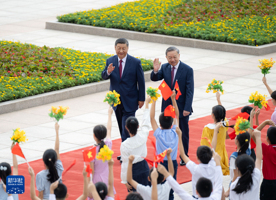 8月19日,中共中央總書記、國(guó)家主席習(xí)近平在北京人民大會(huì)堂同來(lái)華進(jìn)行國(guó)事訪問(wèn)的越共中央總書記、國(guó)家主席蘇林舉行會(huì)談。這是會(huì)談前,習(xí)近平在人民大會(huì)堂東門外廣場(chǎng)為蘇林舉行歡迎儀式。新華社記者 姚大偉 攝