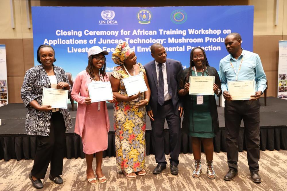 8月初,在非洲地區(qū)菌草技術(shù)培訓(xùn)班舉辦期間,聯(lián)合國(guó)官員和使團(tuán)代表團(tuán)專程赴盧旺達(dá)考察菌草技術(shù)和產(chǎn)業(yè)在非洲地區(qū)的發(fā)展。“我很高興同其他聯(lián)合國(guó)官員一起,親眼見證菌草技術(shù)以實(shí)際行動(dòng)造福民眾?!甭?lián)合國(guó)秘書長(zhǎng)辦公室主任考特尼·拉特雷說,菌草技術(shù)具有“可負(fù)擔(dān)”的突出優(yōu)勢(shì),“對(duì)非洲大陸所有發(fā)展中國(guó)家很有價(jià)值、非常適用”。