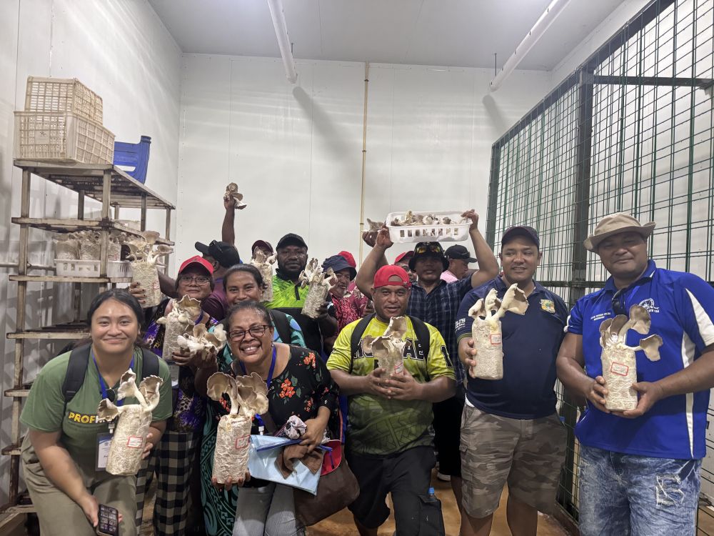 2月28日,在斐濟(jì)楠迪,培訓(xùn)班學(xué)員手捧菌草菇合影。新華社發(fā)(中國(guó)援斐濟(jì)菌草技術(shù)示范中心供圖)