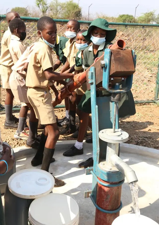 2021年11月,在津巴布韋南馬塔貝萊蘭省省會(huì)關(guān)達(dá)的塞農(nóng)多小學(xué),學(xué)生從中國(guó)援建水井里打水。