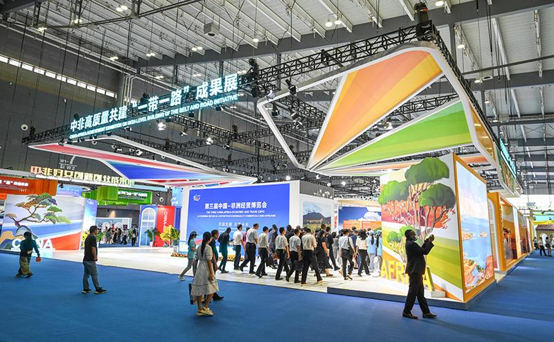 2023年6月29日,第三屆中國(guó)—非洲經(jīng)貿(mào)博覽會(huì)在湖南長(zhǎng)沙開幕。圖為參會(huì)嘉賓在長(zhǎng)沙國(guó)際會(huì)展中心參觀中非高質(zhì)量共建“一帶一路”成果展。