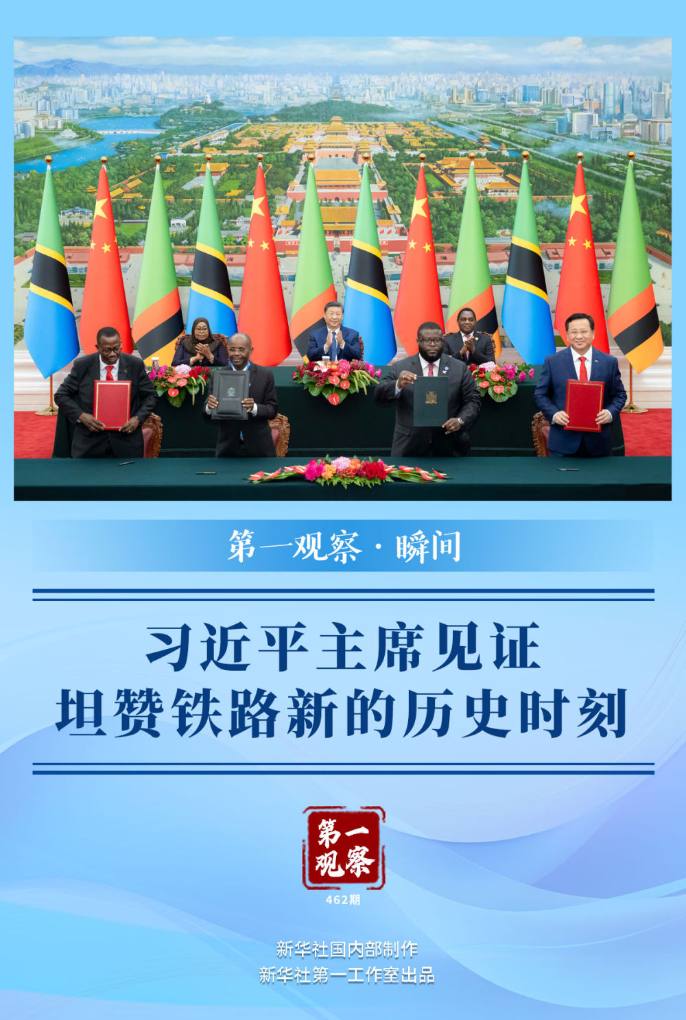 新華社記者用鏡頭記錄下又一歷史時刻——習近平主席同來華出席中非合作論壇北京峰會的坦桑尼亞總統(tǒng)哈桑、贊比亞總統(tǒng)希奇萊馬,在這里共同見證簽署《坦贊鐵路激活項目諒解備忘錄》。簽署完畢,現(xiàn)場熱烈的掌聲經久不息。