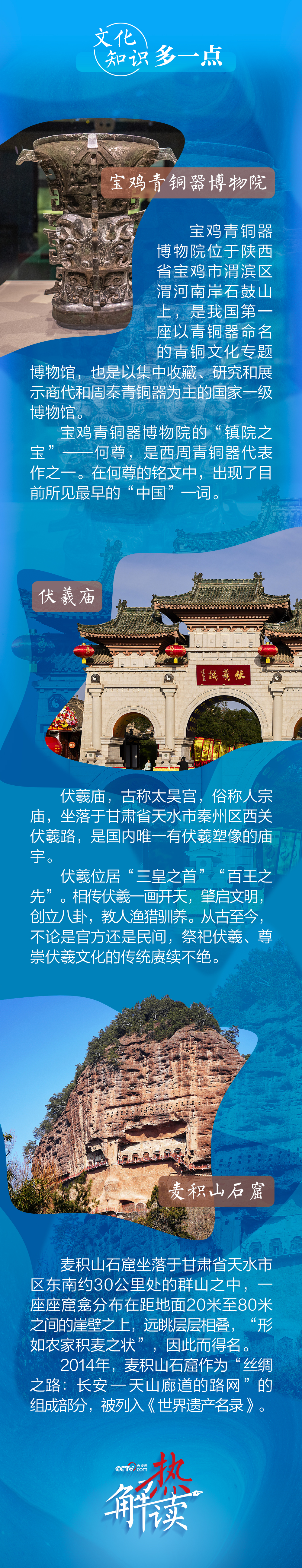 熱解讀9月10日下午至11日上午,習近平總書記先后來到陜西省寶雞市和甘肅省天水市考察調研。此次陜甘行中,總書記專門考察了三處文化地標。
