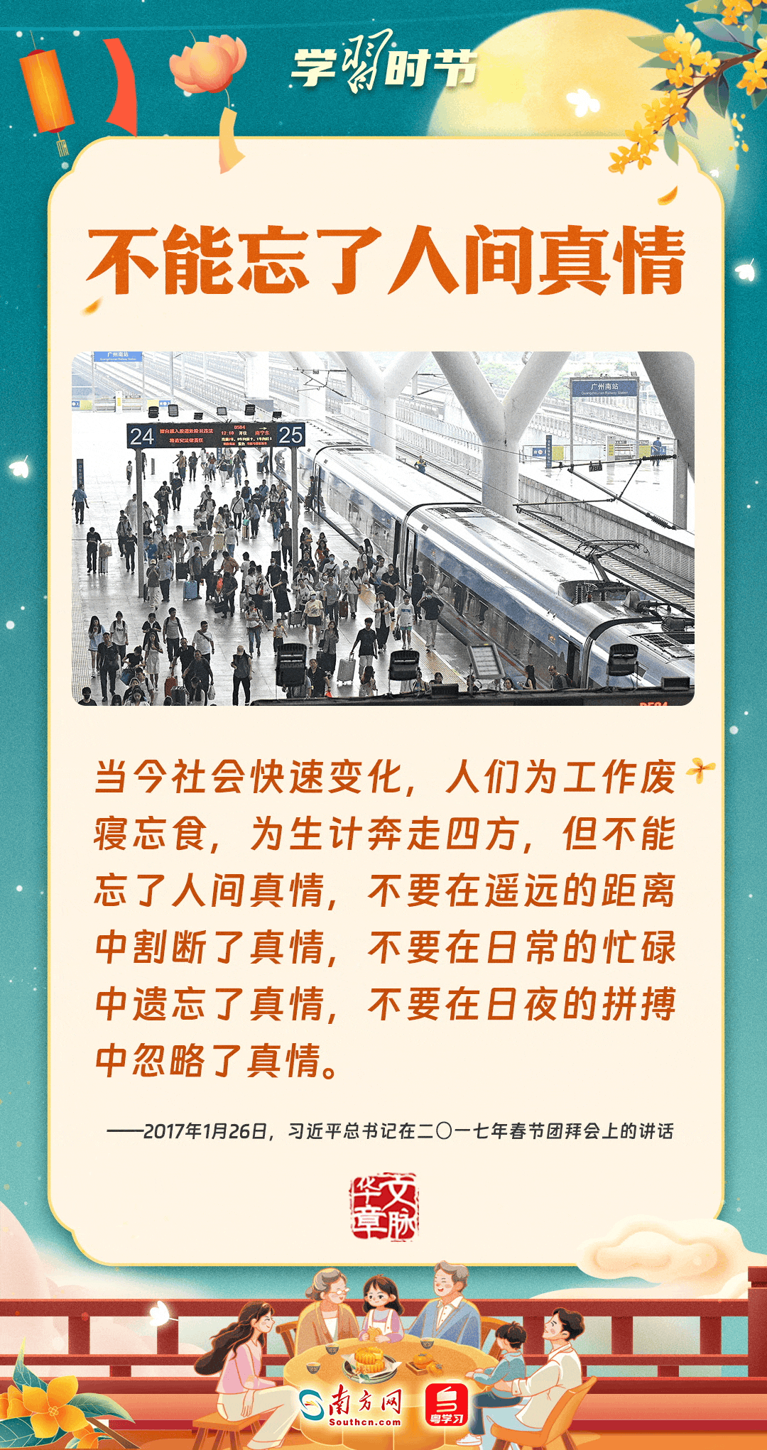 明月寄相思,家國總關情。作為中華優(yōu)秀傳統(tǒng)文化的重要載體之一,中秋節(jié)不但寄托著海內外華人對闔家團圓的美好期許,還承載著深厚的故鄉(xiāng)情、家國情。習近平總書記曾在多個場合深刻闡述個人、家庭與國家之間的關系,強調要厚植家國情懷,把實現個人夢、家庭夢融入國家夢、民族夢之中。中秋佳節(jié),讓我們一起回顧總書記那些經典話語,共同感受他至深至厚的家國情懷。