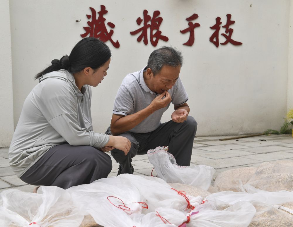 2024年8月22日,在永豐村水稻科技小院,長期駐守在此的四川農(nóng)業(yè)大學(xué)學(xué)生測量稻谷含水量。
