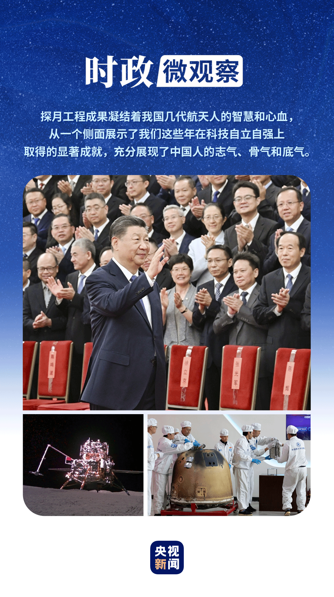 此前嫦娥三號、嫦娥四號、嫦娥五號任務(wù)成功后,習(xí)近平總書記都親切會見了任務(wù)參研參試人員代表,向他們表示祝賀和慰問,對中國探月工程提出殷切期望。