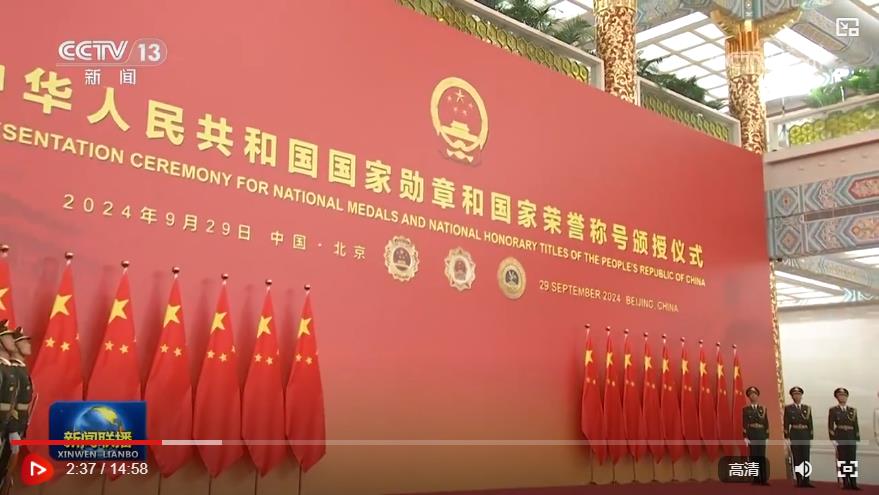 人民大會(huì)堂金色大廳,氣氛莊重?zé)崃?。巨幅紅色背景板上,共和國勛章、友誼勛章和國家榮譽(yù)稱號(hào)獎(jiǎng)?wù)聢D案熠熠生輝。背景板前,18面鮮艷的五星紅旗分列兩側(cè),18名英姿挺拔的禮兵持槍佇立。