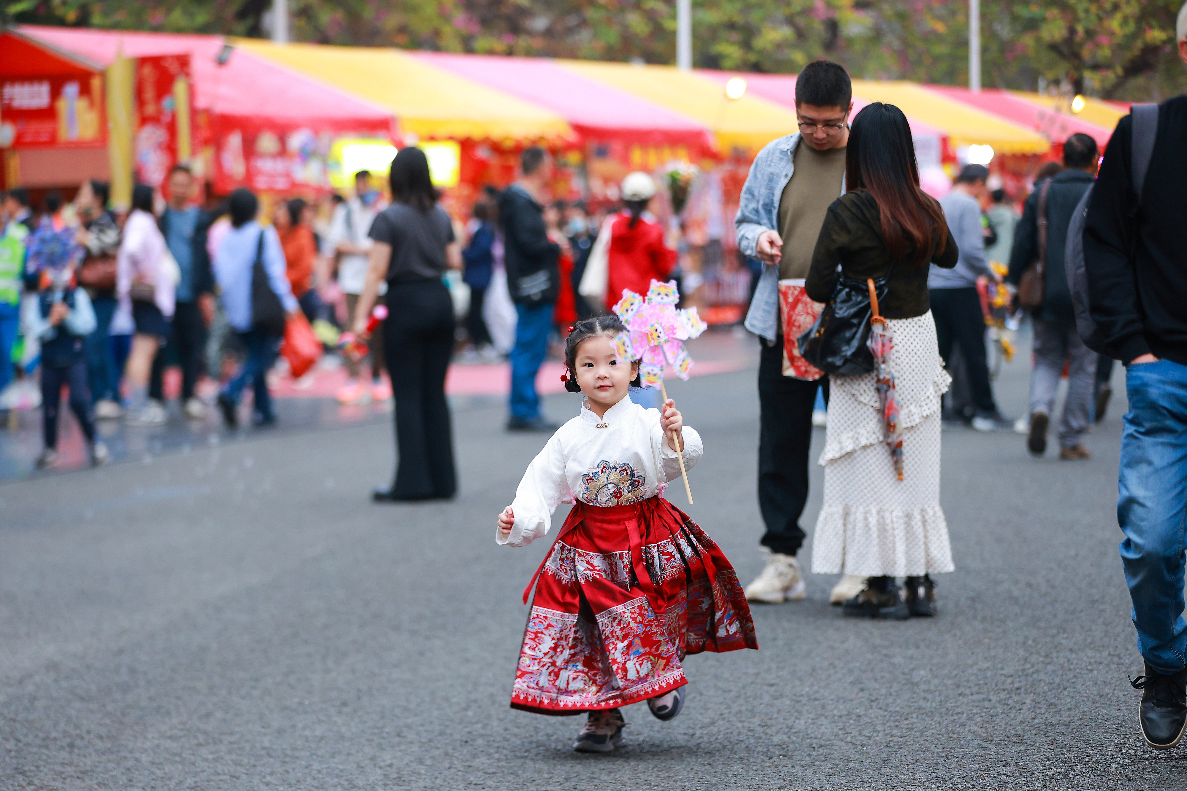 拿著風車穿著馬面裙的小女孩在廣州的花市上開心奔跑。