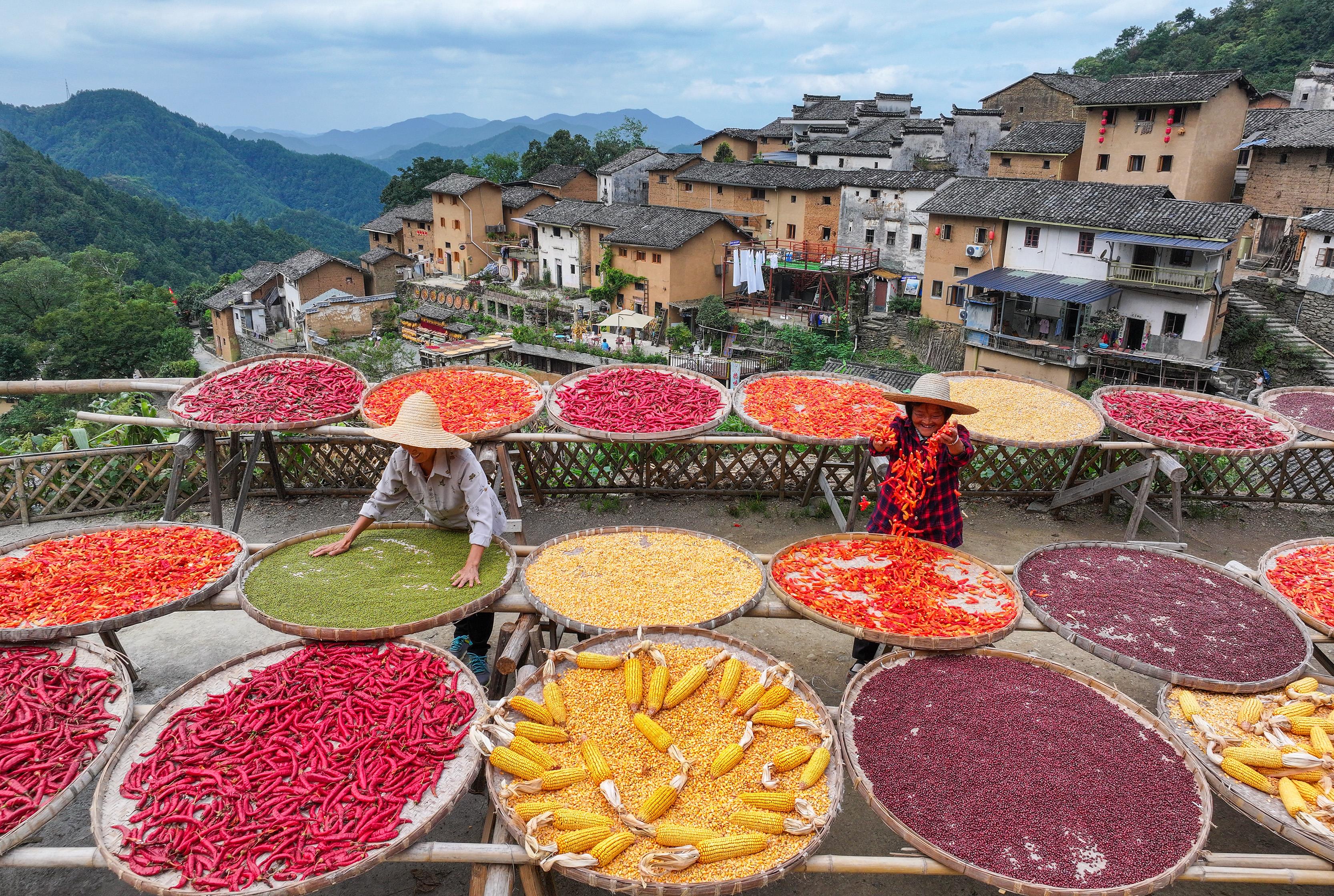 2024年9月22日,安徽省黃山市歙縣陽產(chǎn)村,村民正在土樓前晾曬農作物。