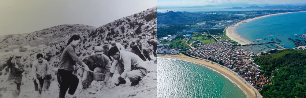 拼版照片:左圖為東山縣群眾在荒山上種植樹苗(資料照片);右圖為2020年6月18日拍攝的東山縣陳城鎮(zhèn)澳角村附近風(fēng)光(無人機照片,新華社記者 姜克紅 攝)。