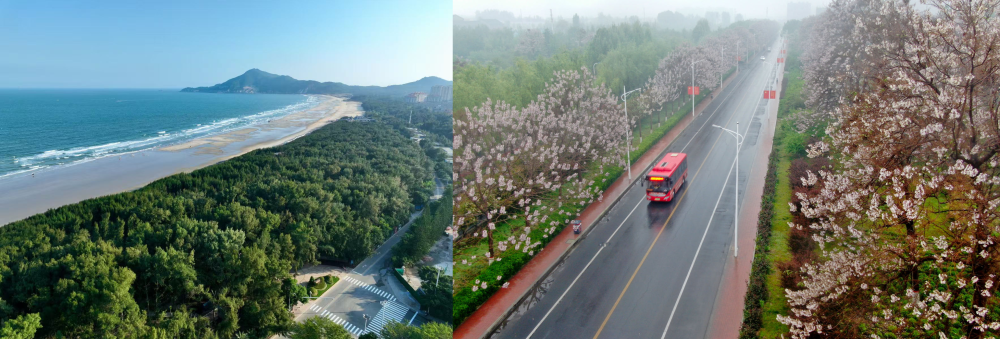 拼版照片:左圖為位于東山縣金鑾灣沿岸的木麻黃防護林帶(無人機照片,新華社記者 姜克紅 攝);右圖為2021年4月20日在蘭考縣焦裕祿干部學(xué)院附近拍攝的泡桐花(無人機照片,新華社記者 郝源 攝)。