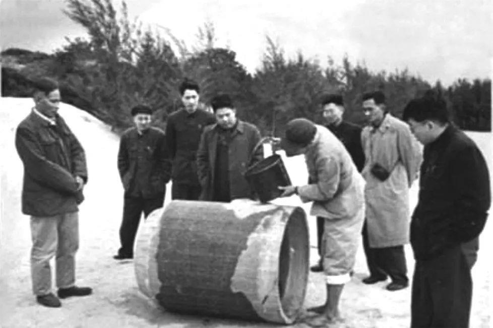 谷文昌在湖尾地下水工地與工程技術人員一起試驗濾水管。