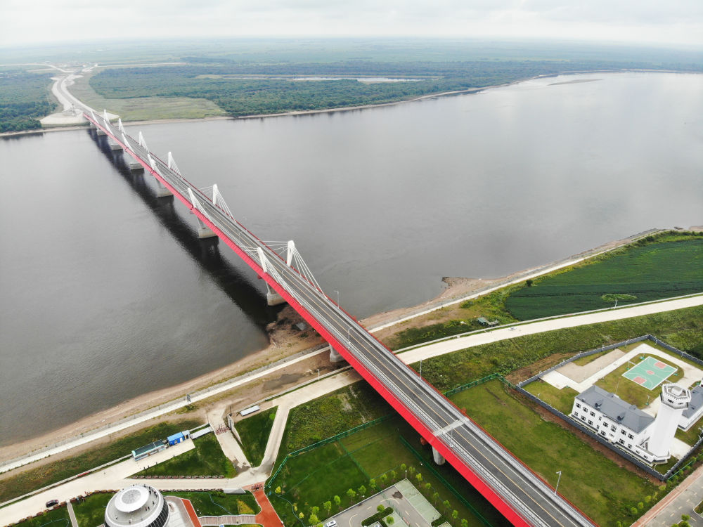 這是在中國(guó)黑河一側(cè)拍攝的黑河-布拉戈維申斯克公路橋(2023年8月11日攝,無(wú)人機(jī)照片)。2022年6月10日,這座中俄首座跨黑龍江公路大橋正式通車,在中國(guó)東北地區(qū)和俄羅斯遠(yuǎn)東地區(qū)之間開辟了新的國(guó)際運(yùn)輸通道。