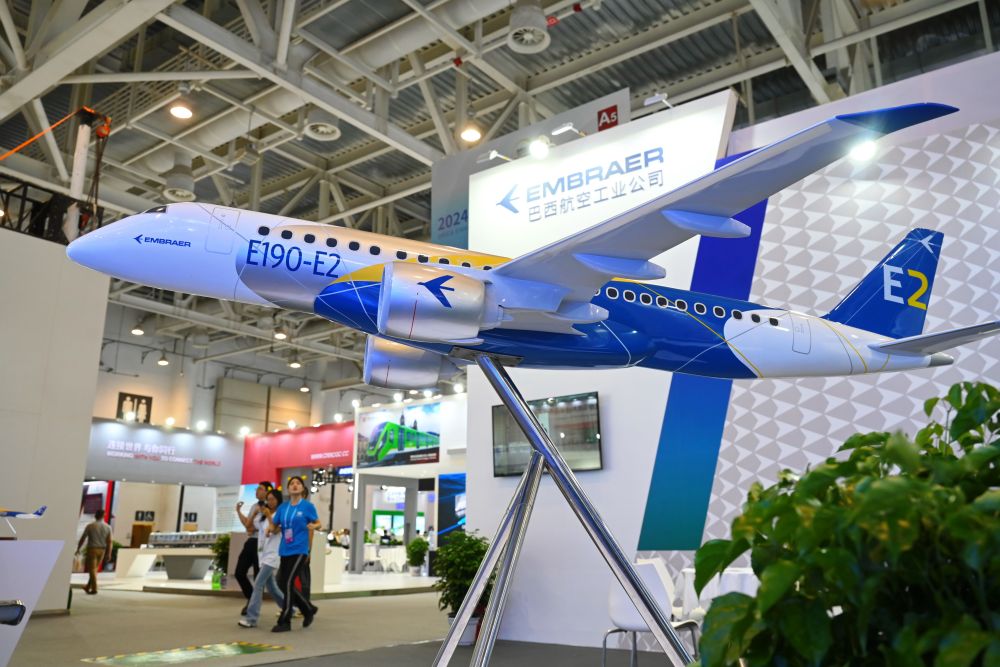 這是在廈門舉行的2024金磚國(guó)家新工業(yè)革命展巴西展位展出的E190-E2飛機(jī)模型。新華社記者林善傳攝