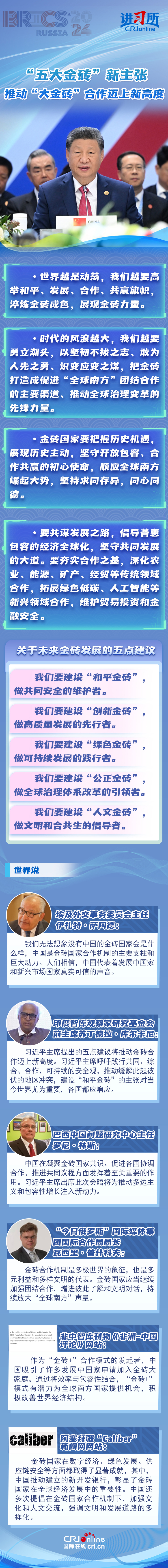 “時代的風浪越大,我們越要勇立潮頭,以堅韌不拔之志、敢為人先之勇、識變應(yīng)變之謀,把金磚打造成促進‘全球南方’團結(jié)合作的主要渠道、推動全球治理變革的先鋒力量。”當?shù)貢r間10月23日,習近平主席在俄羅斯喀山出席金磚國家領(lǐng)導人第十六次會晤并發(fā)表重要講話,提出共建“和平金磚”“創(chuàng)新金磚”“綠色金磚”“公正金磚”“人文金磚”,為“大金磚合作”擘畫藍圖。