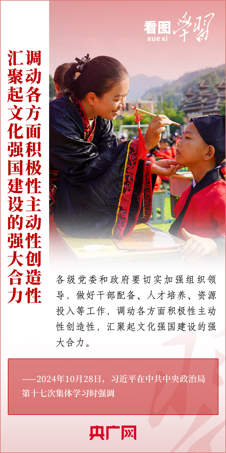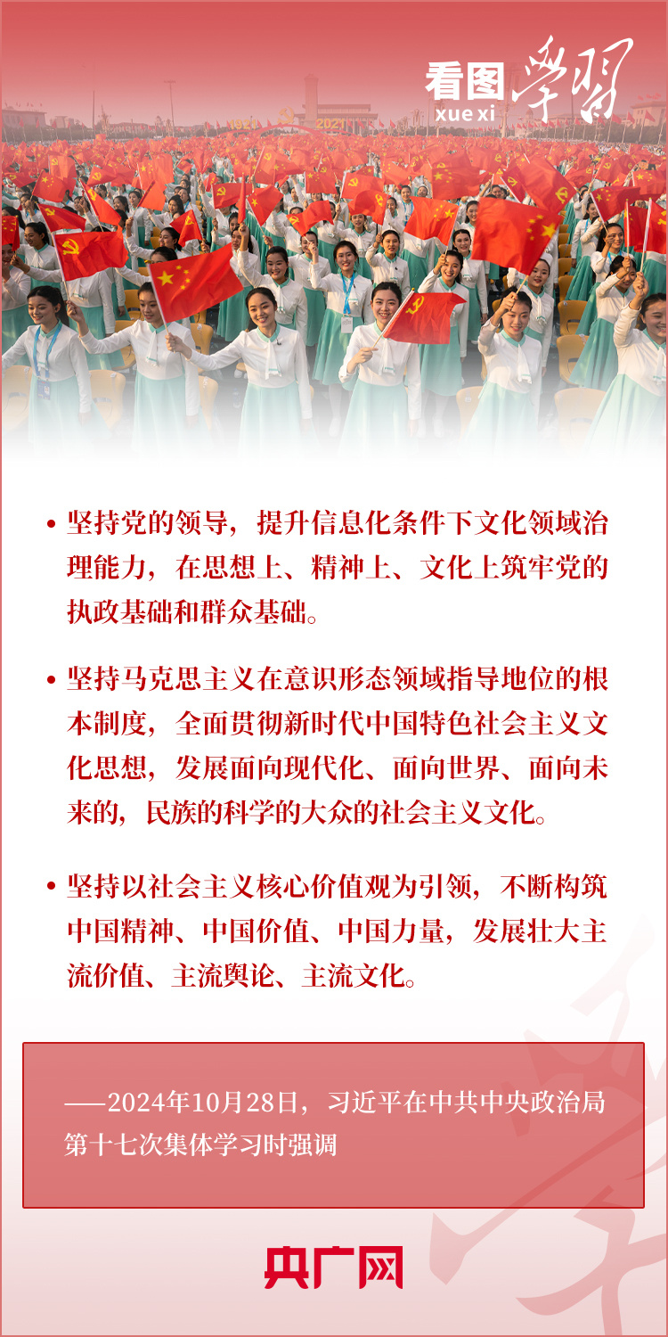 建設(shè)文化強(qiáng)國是全黨全社會(huì)的共同任務(wù)。10月28日,中共中央政治局就建設(shè)文化強(qiáng)國進(jìn)行第十七次集體學(xué)習(xí)。習(xí)近平總書記在聽取講解和討論后發(fā)表重要講話,就錨定2035年建成文化強(qiáng)國戰(zhàn)略目標(biāo)作出最新部署,強(qiáng)調(diào)要“不斷發(fā)展具有強(qiáng)大思想引領(lǐng)力、精神凝聚力、價(jià)值感召力、國際影響力的新時(shí)代中國特色社會(huì)主義文化,不斷增強(qiáng)人民精神力量,筑牢強(qiáng)國建設(shè)、民族復(fù)興的文化根基?!币黄饋韺W(xué)習(xí)!