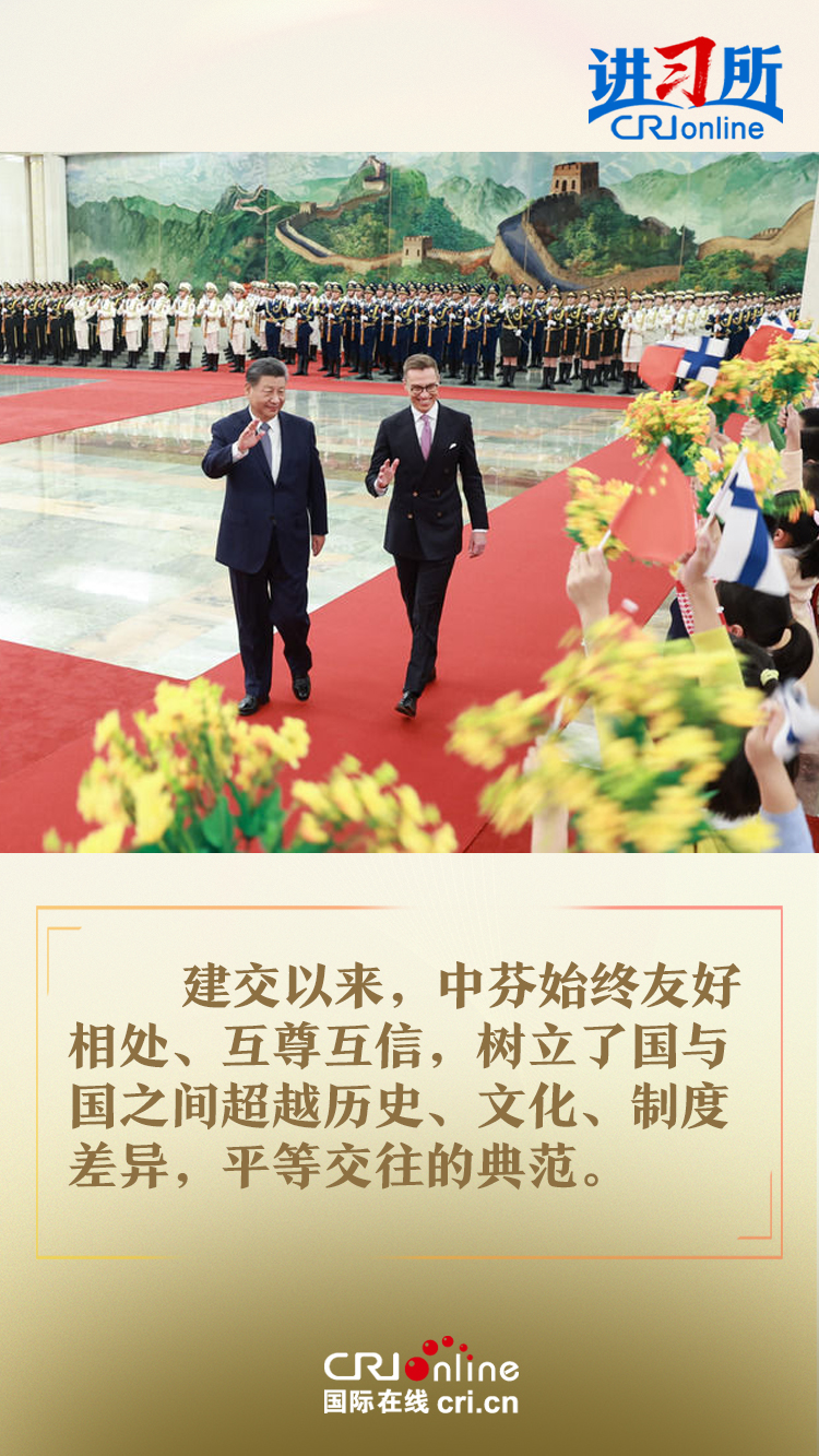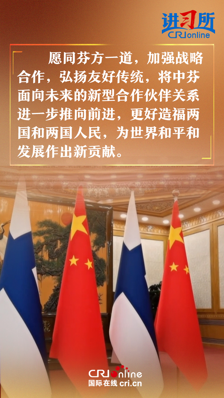 習近平指出,建交以來,中芬始終友好相處、互尊互信,樹立了國與國之間超越歷史、文化、制度差異,平等交往的典范。中方愿同芬方一道,加強戰(zhàn)略合作,弘揚友好傳統(tǒng),將中芬面向未來的新型合作伙伴關系進一步推向前進,更好造福兩國和兩國人民,為世界和平和發(fā)展作出新貢獻。