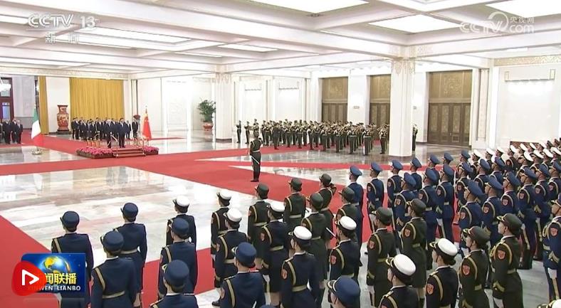 天安門廣場鳴放21響禮炮,禮兵列隊致敬。兩國元首登上檢閱臺,軍樂團奏中意兩國國歌。馬塔雷拉在習近平陪同下檢閱中國人民解放軍儀仗隊,并觀看分列式。