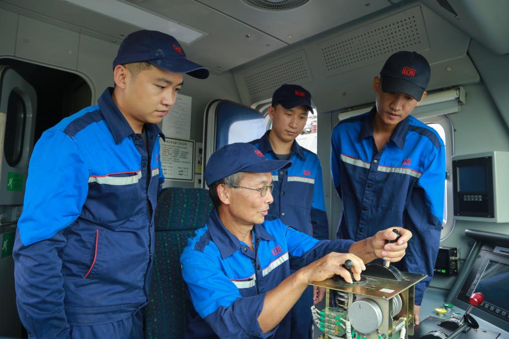 在中老鐵路萬(wàn)象運(yùn)營(yíng)管理中心的機(jī)車(chē)檢修庫(kù)里,中老師徒4人一同對(duì)機(jī)車(chē)部件進(jìn)行攻關(guān)(2024年9月9日攝)。新華社發(fā)(鄭皓文攝)