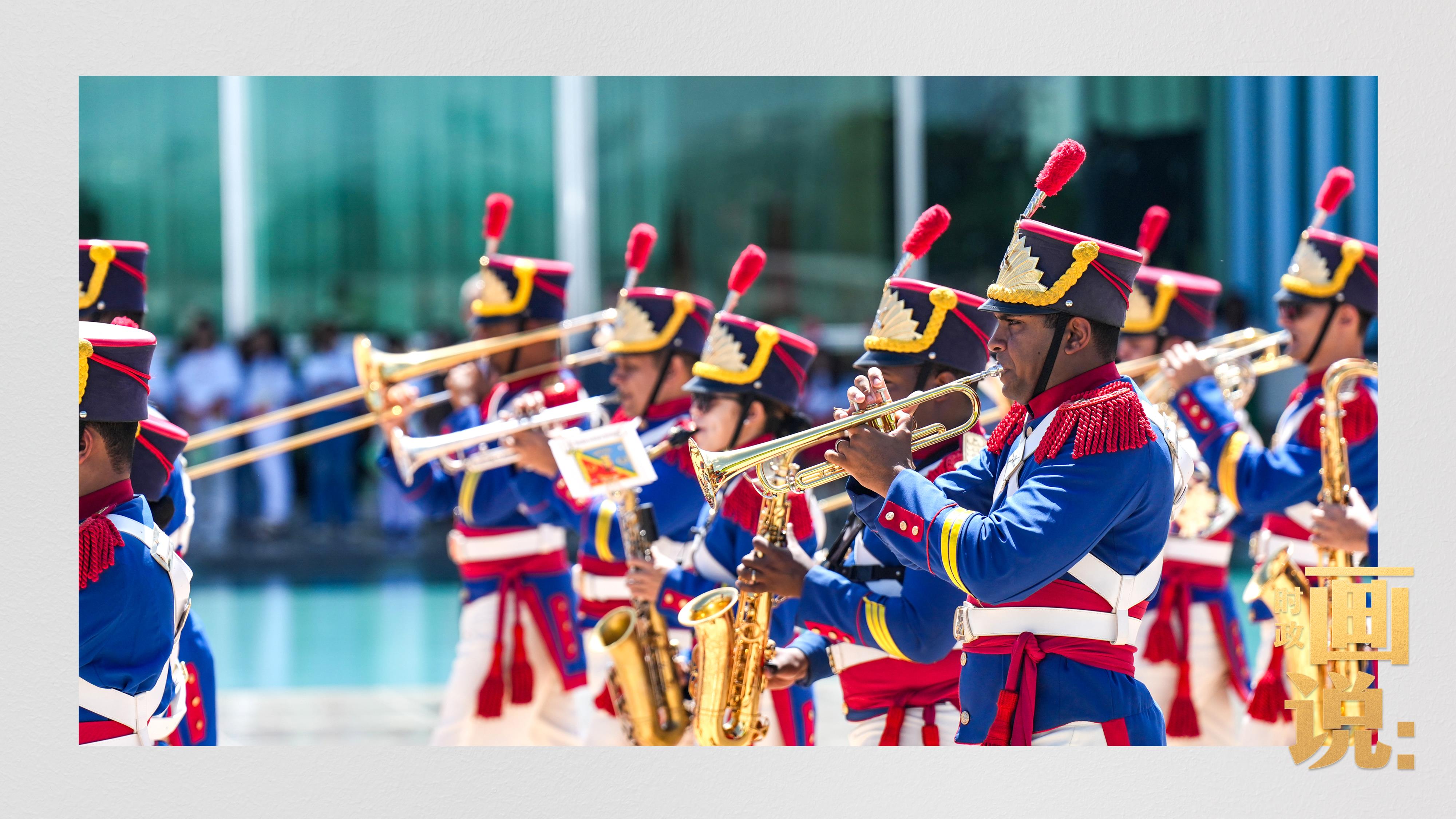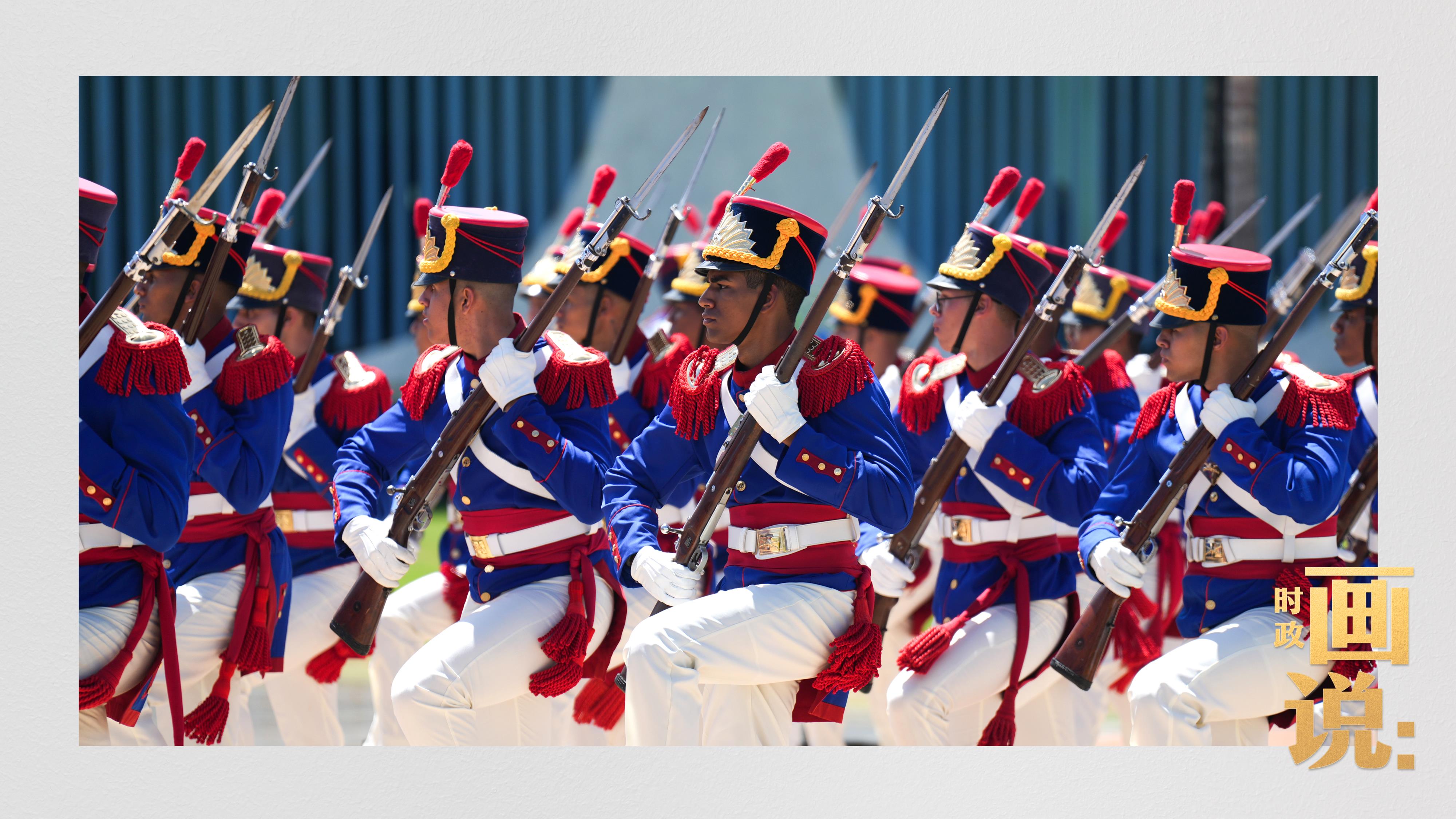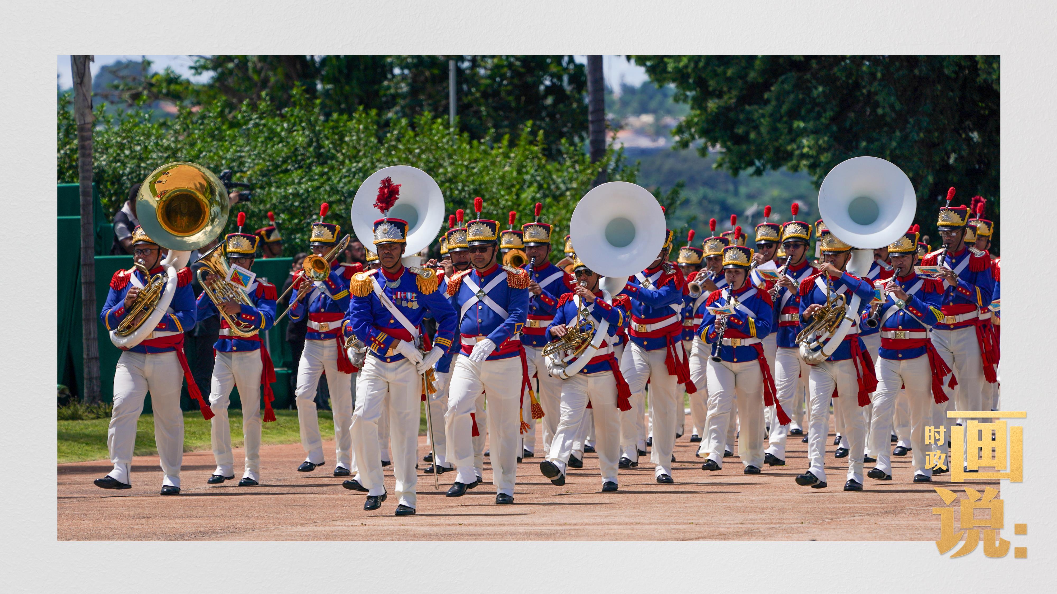 騎兵護衛(wèi)習近平主席專車抵達儀式現(xiàn)場,巴西藝術家用中文深情唱響中國經典民歌《我的祖國》,現(xiàn)場氣氛隆重熱烈。