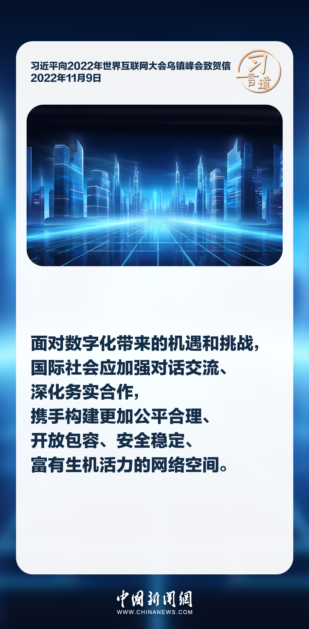 信息革命時(shí)代潮流浩蕩前行,網(wǎng)絡(luò)空間承載著人類(lèi)對(duì)美好未來(lái)的無(wú)限憧憬。習(xí)近平主席多次強(qiáng)調(diào)各國(guó)應(yīng)該共同構(gòu)建網(wǎng)絡(luò)空間命運(yùn)共同體,推動(dòng)網(wǎng)絡(luò)空間互聯(lián)互通、共享共治,為開(kāi)創(chuàng)人類(lèi)發(fā)展更加美好的未來(lái)助力。
