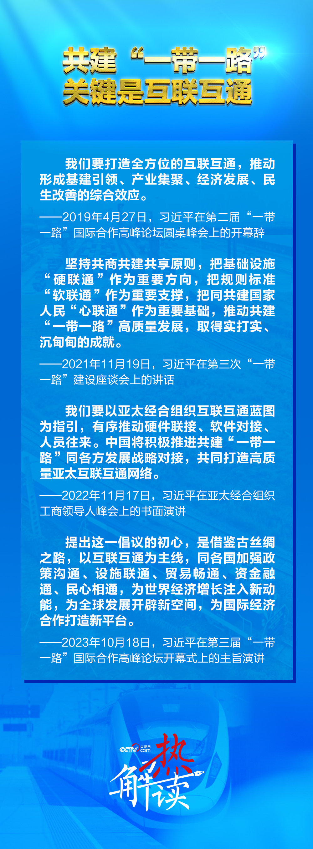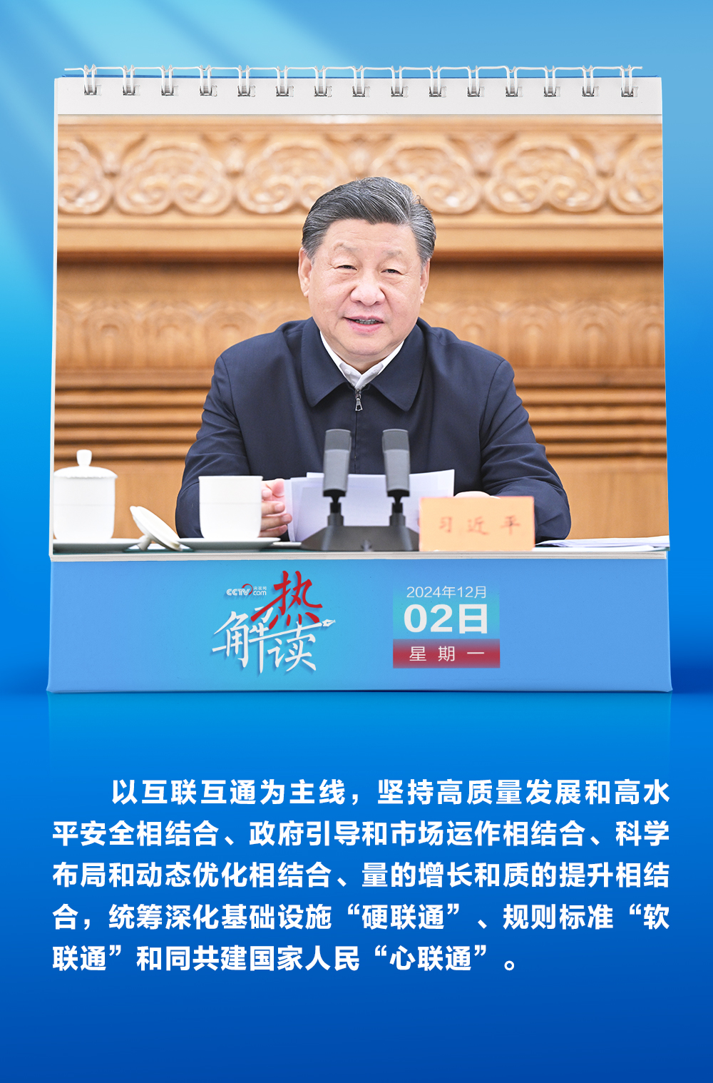 “統(tǒng)籌深化基礎(chǔ)設(shè)施‘硬聯(lián)通’、規(guī)則標(biāo)準(zhǔn)‘軟聯(lián)通’和同共建國(guó)家人民‘心聯(lián)通’”,“完善‘硬聯(lián)通’、‘軟聯(lián)通’、‘心聯(lián)通’協(xié)調(diào)推進(jìn)機(jī)制”。12月2日,習(xí)近平總書記在第四次“一帶一路”建設(shè)工作座談會(huì)上對(duì)深化三個(gè)“聯(lián)通”再作部署。