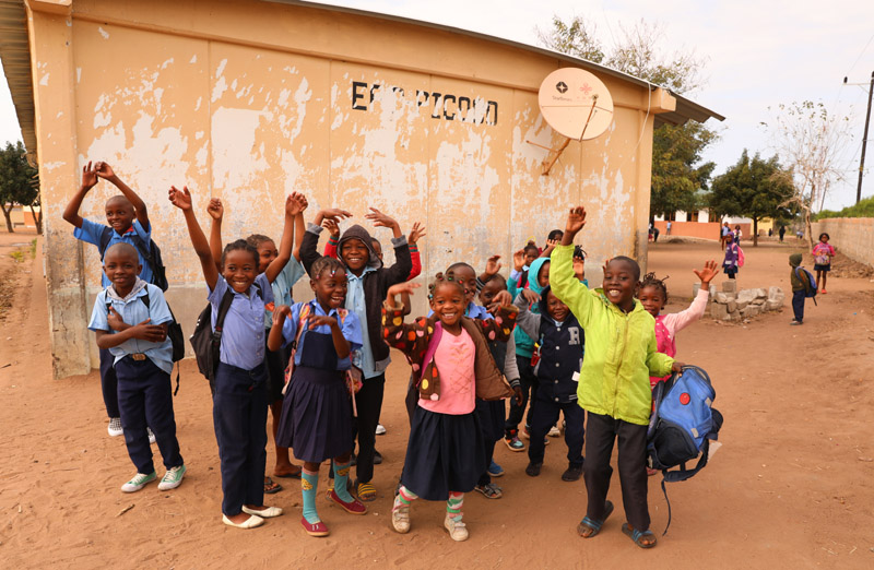 △ 當(dāng)?shù)貢r(shí)間2023年7月25日,莫桑比克馬普托省皮科科村學(xué)校的孩子們站在裝有中國(guó)援助的衛(wèi)星電視接收天線的房屋前。