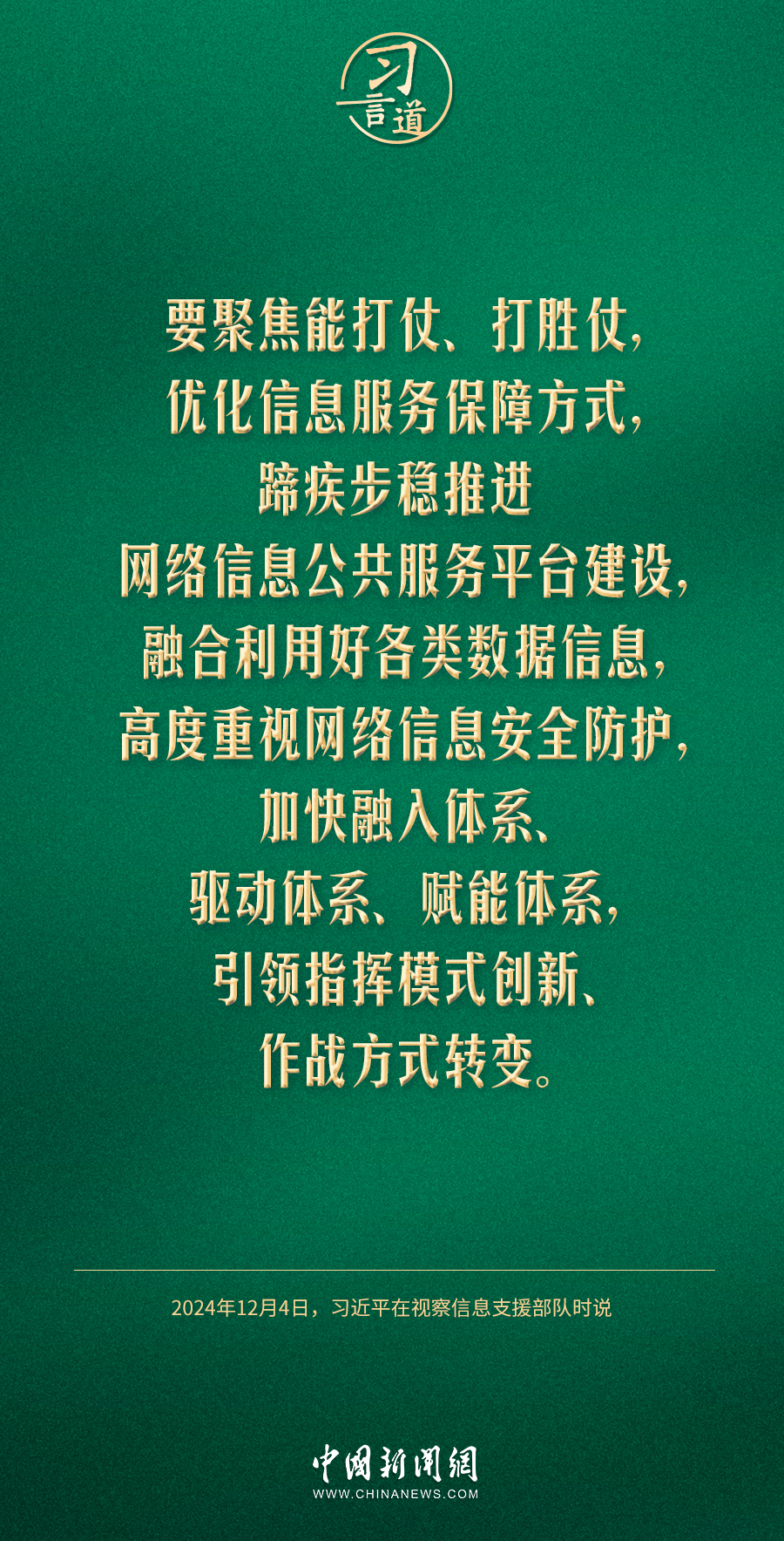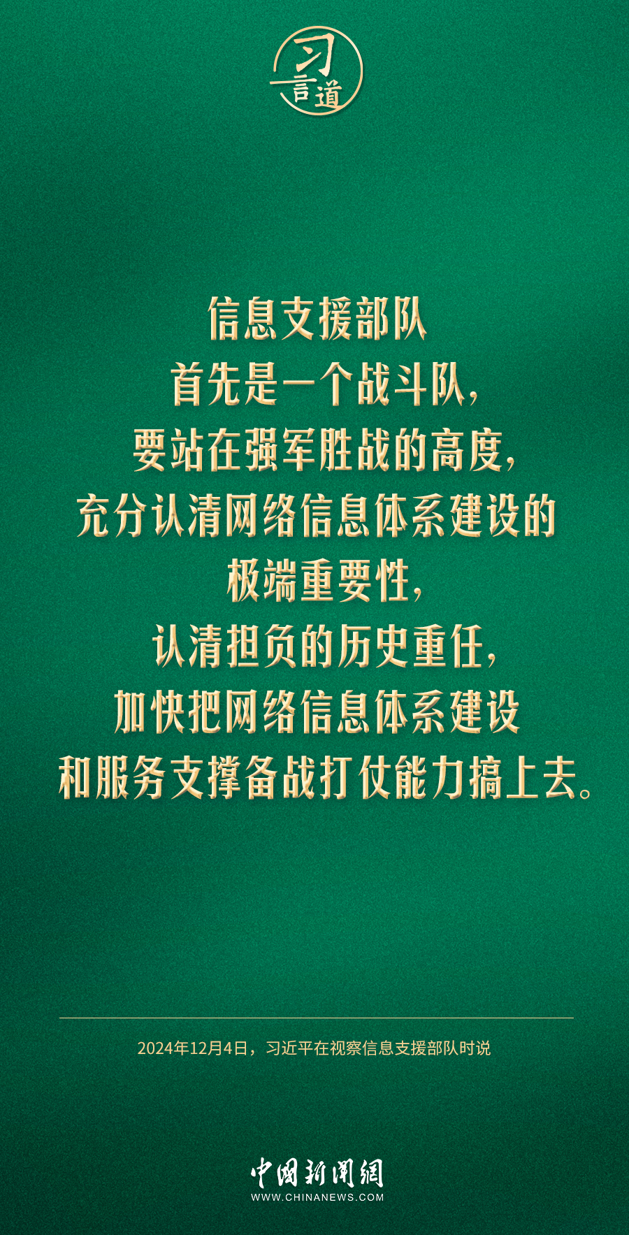 中共中央總書(shū)記、國(guó)家主席、中央軍委主席習(xí)近平4日視察信息支援部隊(duì),代表黨中央和中央軍委,對(duì)信息支援部隊(duì)第一次黨代表大會(huì)的召開(kāi)表示熱烈祝賀,向信息支援部隊(duì)全體官兵致以誠(chéng)摯問(wèn)候。習(xí)近平指出——