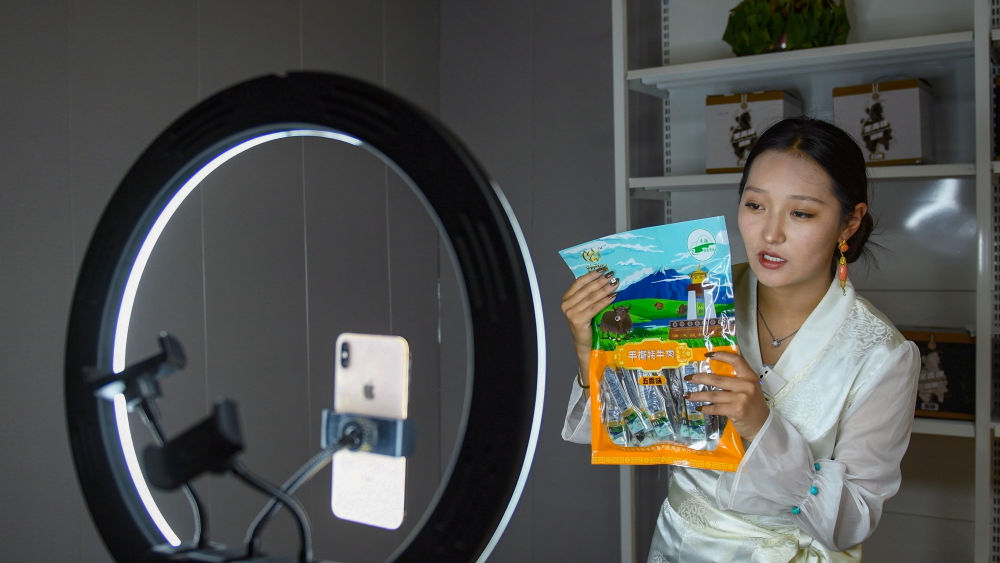 9月24日,果洛藏貢麻村村民多杰吉在進(jìn)行網(wǎng)絡(luò)帶貨直播。(潘彬彬 攝)