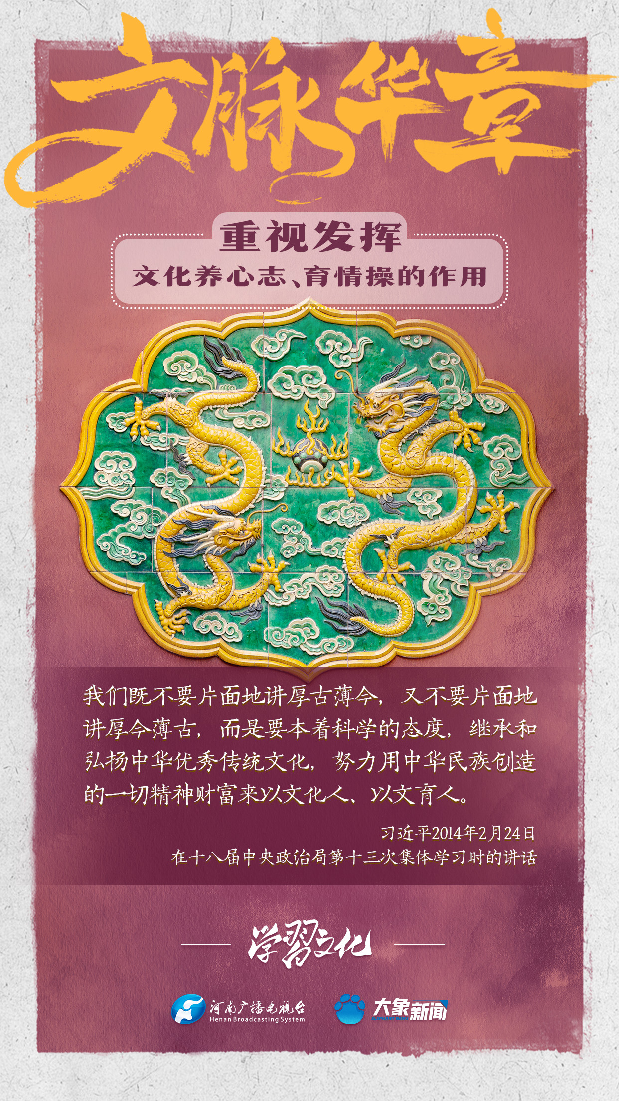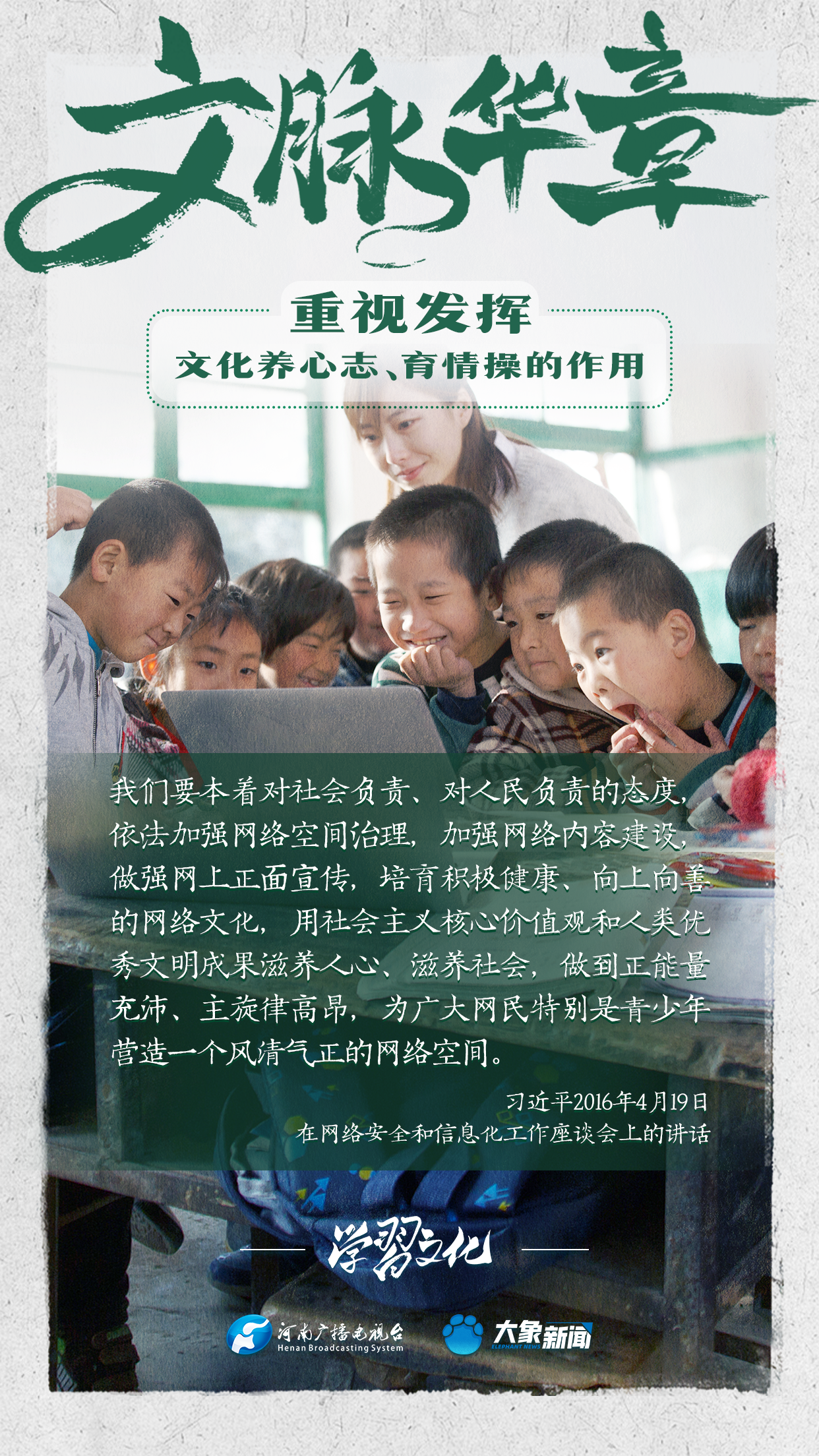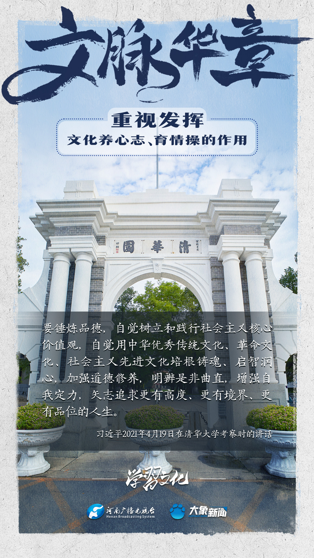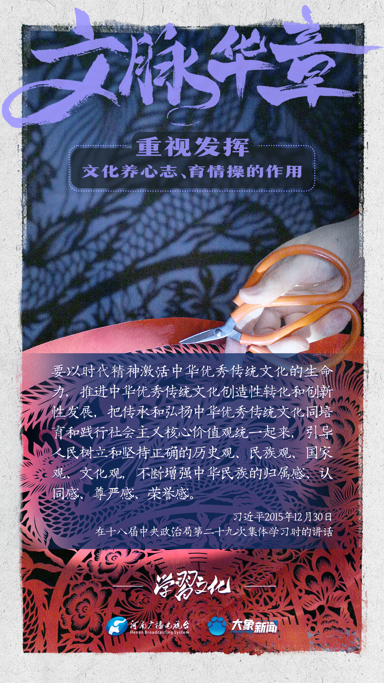 習(xí)近平總書記在主持中共中央政治局第十七次集體學(xué)習(xí)時(shí)強(qiáng)調(diào),重視發(fā)揮文化養(yǎng)心志、育情操的作用,涵養(yǎng)全民族昂揚(yáng)奮發(fā)的精神氣質(zhì)??倳浉叨戎匾曃幕淖饔?,發(fā)表了一系列重要講話,倡導(dǎo)以文載道、以文傳聲、以文化人。我們一起學(xué)習(xí)。